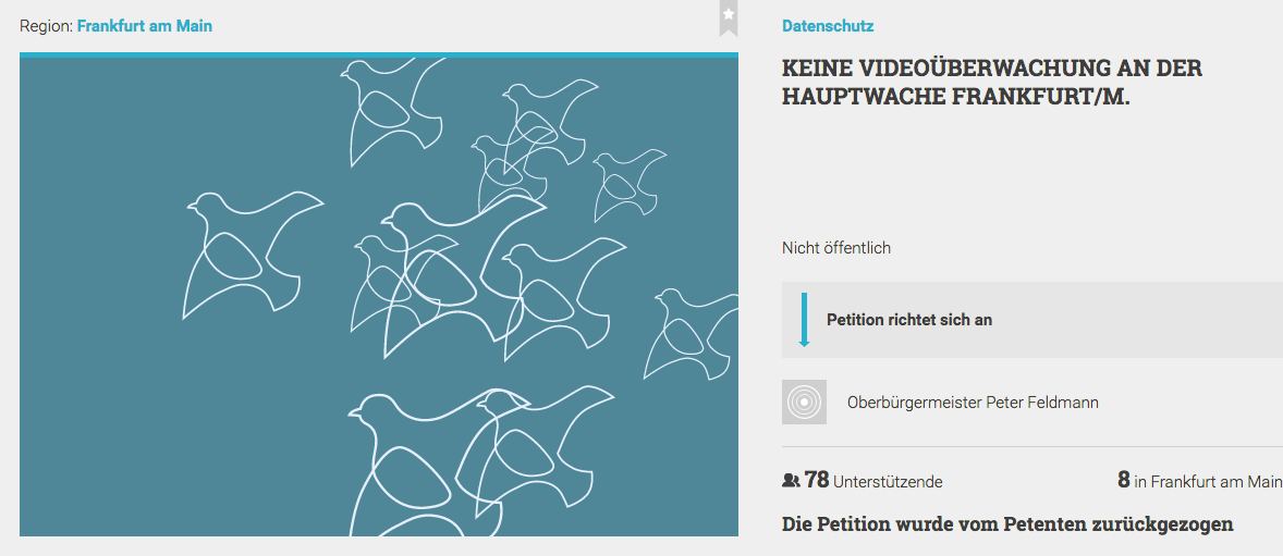 Ich habe schon im April die Stellungnahme „Keine Videoüberwachung an der Hauptwache!“ von der Gruppe „dieDatenschützer Rhein Main“ unterzeichnet und auch darüber gebloggt gehabt. Nun gibt es eine Online Petition, die ihr auch unterzeichnen könnt: