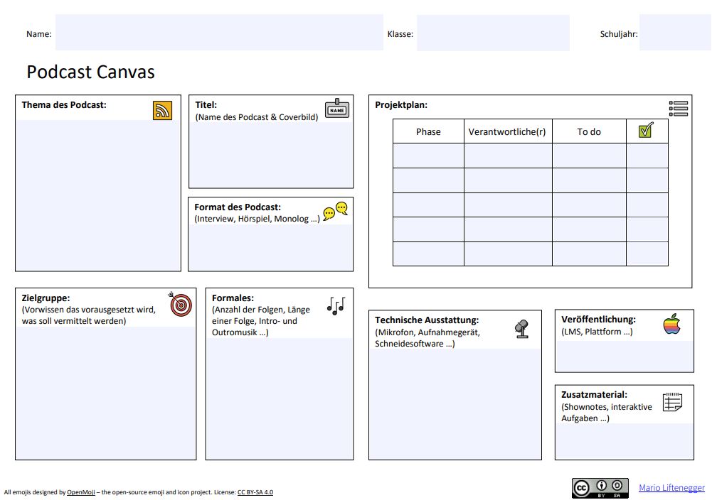 Also hab ich mir den Tweet und die Antworten genauer angesehen, weil viel Interesse und Rückmeldung dazu folgte. In den Antworten (Twitter Replies) ist die PDF Datei auch verlinkt (Dropbox-Link) und bei Interesse an einem beschreibbaren digitalen Format hilft Mario auch gerne via Direktnachricht weiter (übrigens gibt es weitere Materialien auf seiner Website). Das Podcast Canvas ist für Schülerinnen und Schüler erstellt worden, aber ich finde eine gute Möglichkeit das für andere Projektinitiativen zu ändern.