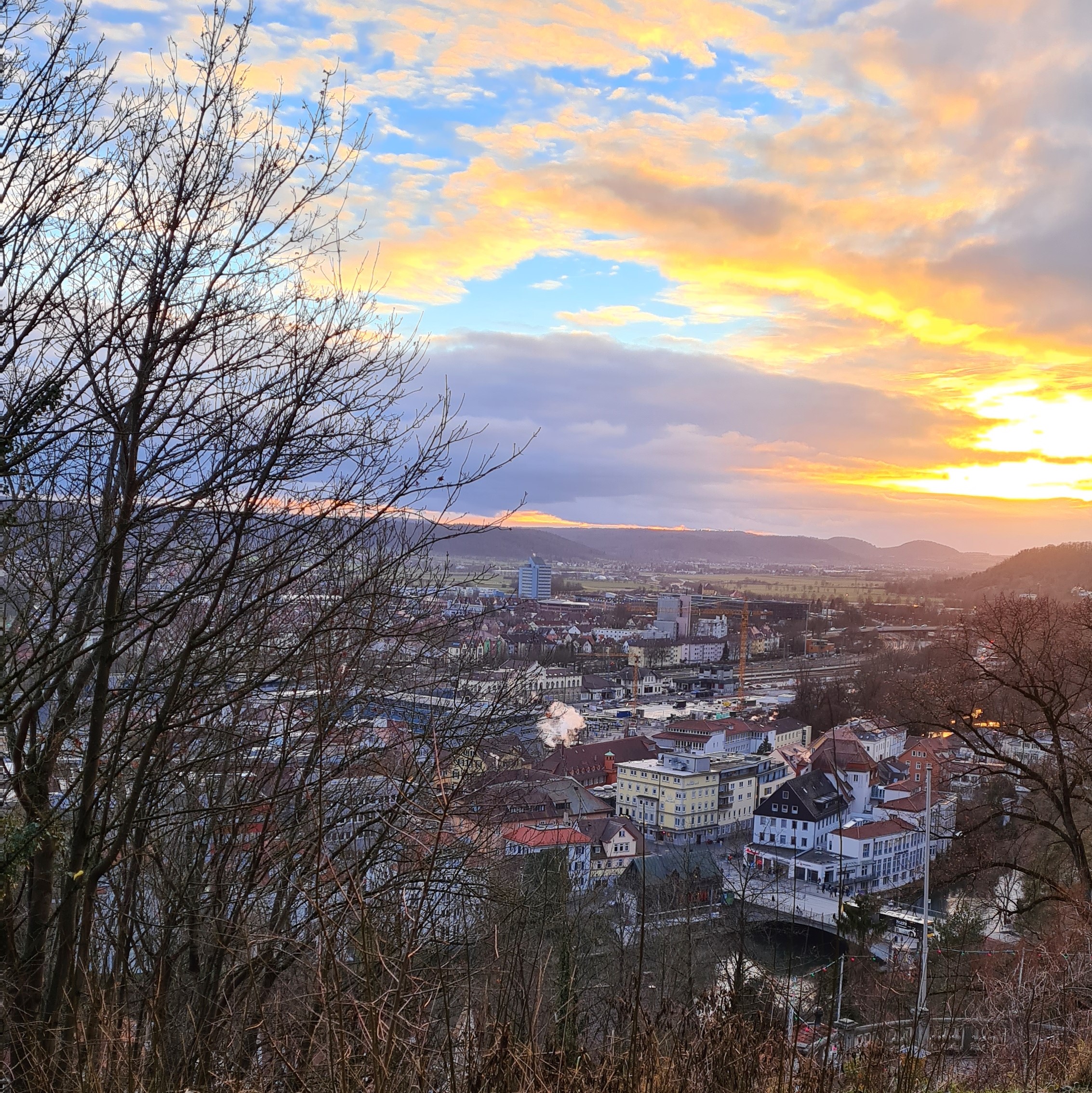 Es war für Januar weiterhin ein recht mildes aber kühles Wetter. Und Freitagmittag hatten wir die Möglichkeit einen Spaziergang zu machen und waren kurz an der Wielandshöhe und wurden bei untergehender Sonne mit einem schönen Ausblick belohnt. Wir waren tagsüber unten und haben den umgebauten Omnisbusbahnhof gesehen (ja, der ist noch nicht ganz fertig, speziell wird auch der Bahnhofsbereich und der gesamte Platz davor noch umgebaut…) Oben auf der Wielandshöhe jedenfalls hatten wir einen schönen Blick darauf.