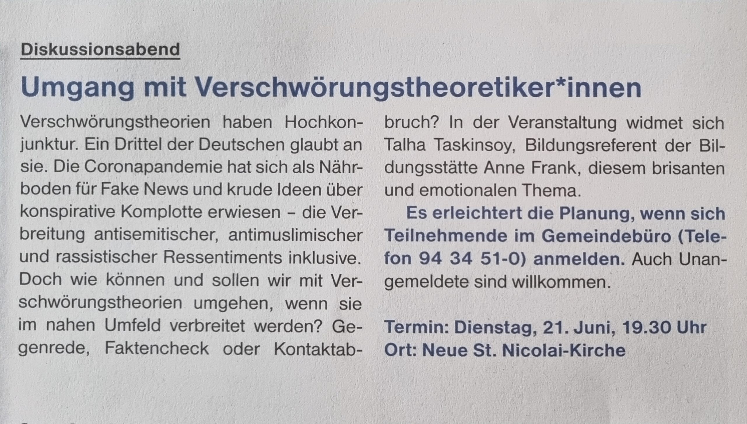 Am Dienstag, 21. Juni 2022 um 19:30 Uhr findet in der Neuen St. Nicolai-Kirche Frankfurt ein Diskussionsabend zu „Umgang mit Verschwörungstheoretiker*innen“ statt. Über die aktuelle Ausgabe des Nicolai Boten bin ich darüber aufmerksam geworden.