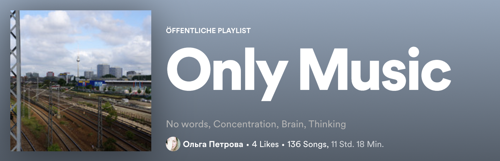 At work we are exchanging our music playlists and this one (and in future also others) I want to also share with you. This playlist has no words (almost), only music. The coworker described the „Only Music“ Playlist like this: