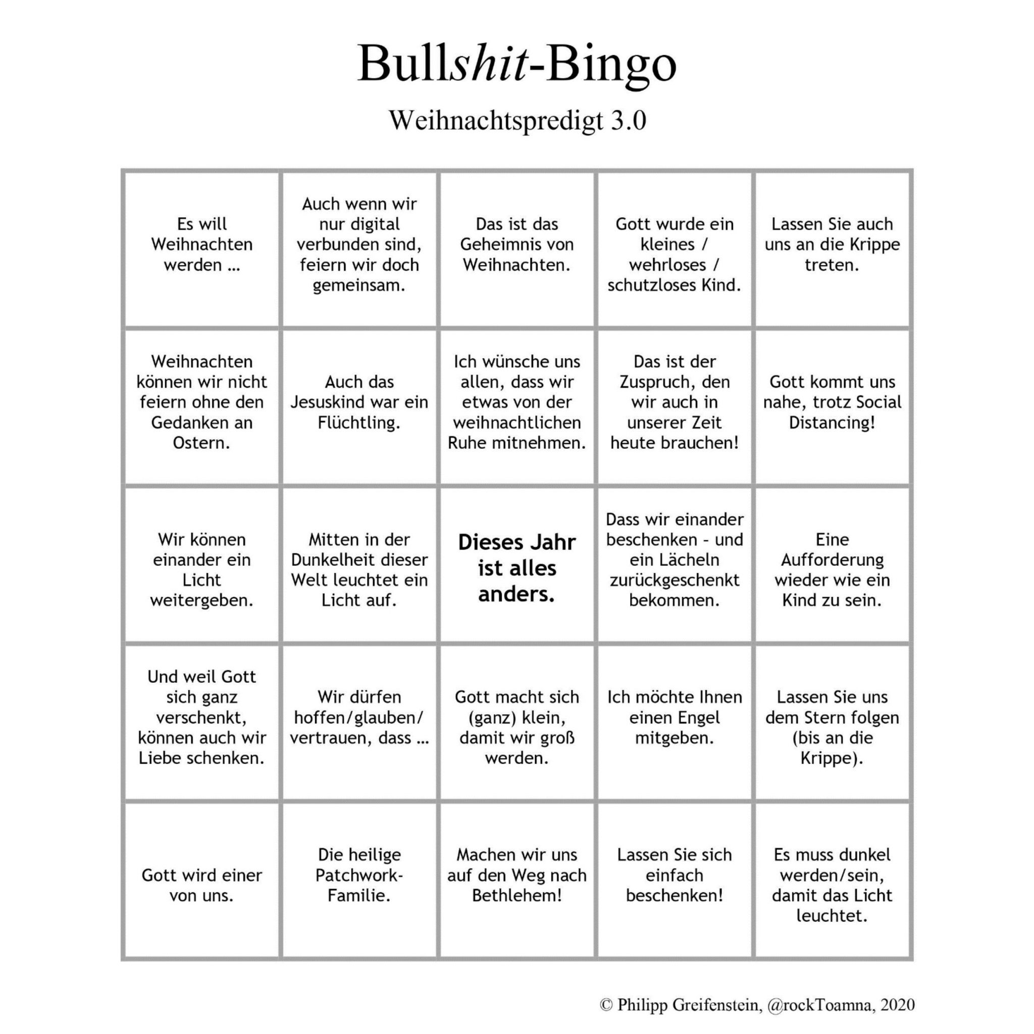 Vor einigen Tagen habe ich das entweder auf Instagram oder irgendwo anders gesehen gehabt, aber zuerst nicht dran geglaubt. Aber dann doch heute (sehr früh am morgen) erneut recherchiert (okay, kleine Suche in einer Internetsuchmaschine) und dann freudig fündig geworden. Es ist wahr, Philipp G hat eine neue Version des Bullshit-Bingo Weihnachtspredigt herausgebracht. Es ist Version 3.0.