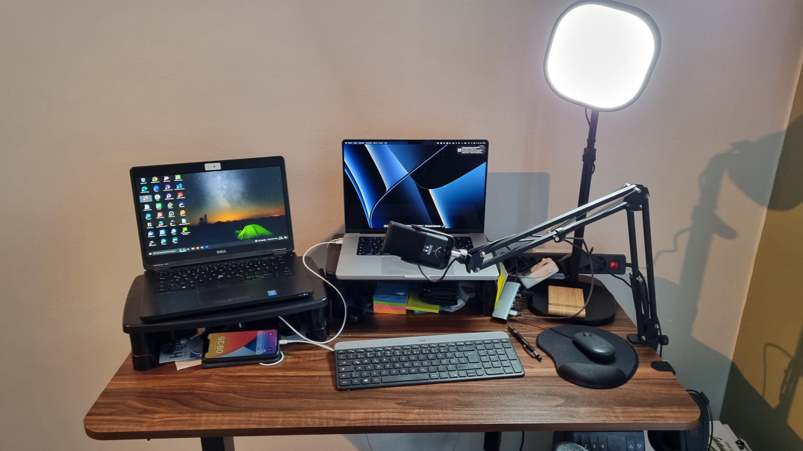 Beim Licht habe ich früher experimentiert und so ein LED Ringlicht oder externe sehr helle LED Scheinwerfer hingestellt. Das hat auf die Dauer nicht gut harmoniert, da ich schnell vom Licht geblendet war und die Ausgaben hierfür sich unter 50 Euro hielten. Außerdem waren die Kabel und Stative Stolperfallen in dem beengten Raum (damals) und belegten zusätzlich mehrere Steckdosen Plätze, die ich immer wieder mit anderen Stromabnehmern tauschen musste. Nicht wirklich ideal für agiles Arbeiten und wohl fühlte ich mich auch nicht.