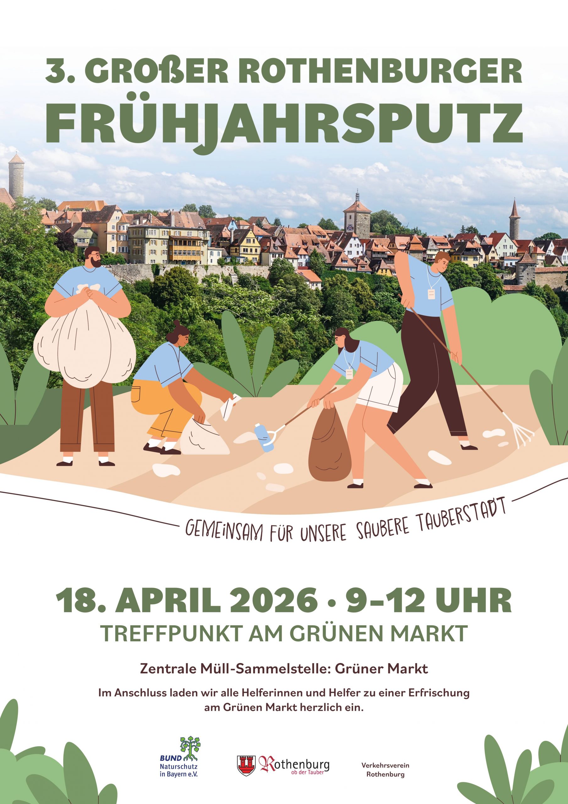 Am Samstag, den 18. April 2026, veranstaltet die Stadt Rothenburg in Zusammenarbeit mit dem Verkehrsverein sowie dem Bund Naturschutz – und gerne allen Bürgerinnen und Bürgern – zum dritten Mal den Aktionstag „Rothenburger Frühjahrsputz“, diesmal unter dem Motto ist:“ Gemeinsam für unsere saubere Tauberstadt.“